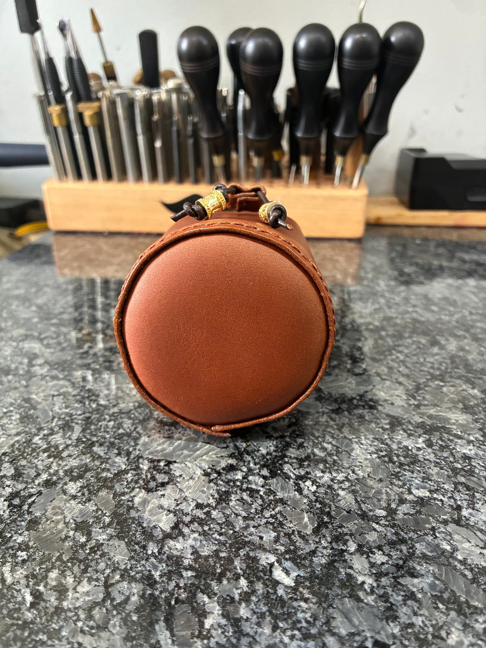These leather dice bags are completely done by hand. Made with either Crazy Horse water buffalo leather or RedRock waxy pull up leather depending on what color you order. Both are 3oz. thick to give enough flex but still be strong enough to last. Comes with golden colored brass eyelets for drawstring and comes with gold plated charms that hang from drawstring for some character. Gold charms will always match but may vary from what is seen in photo. Edges are beveled, burnished, edge koted and resolened for a clean shiny look plus added durability. The bas dimensions are 3.25" tall and 2.75" across.
